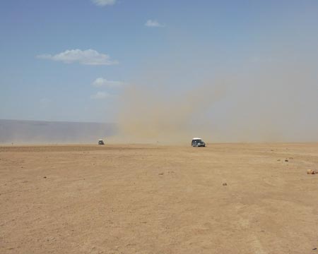 ve stínu mého vozu. Už je na dohled zase kamenná poušť, ale když se ohlédneme za sebe vidíme, jak působí písečné moře nekonečně. Nakonec si rozvášněné Campo vyzkoušelo jak