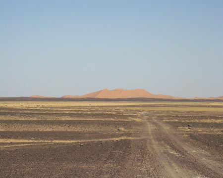 Představte si naprosto rovnou kamennou poušť, po které musíte překonat téměř 40 km než se dostanete k největšímu marockému písečnému moři. Ergy jsou písečná moře, odtud