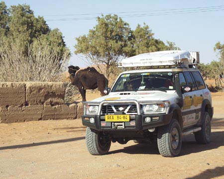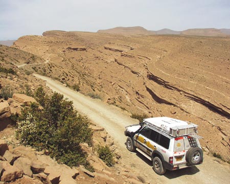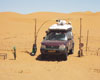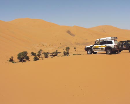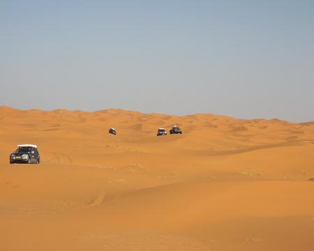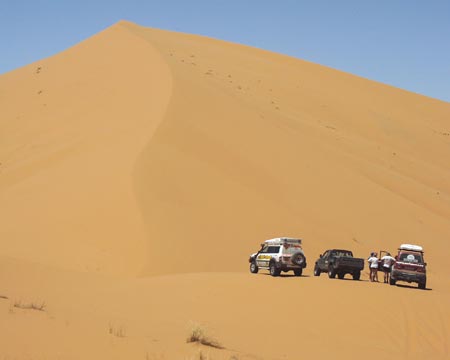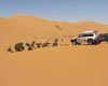 že zdoláme Erg Chebbi. Ve vozech zůstávají jen osádky, voda a malá zásoba jídla. Domlouvám se s Hasanem, že nás povede jeho syn Alli. A tak nám mladý Tuarég určuje směr kudy se vydáme do středu dun, kde se nachází oáza. Pomalu tedy vplouváme se svými koráby do vln písečného moře Erg Chebbi. Trochu nás překvapí, když nás Alli vede na duny, na které by jsme se sami neodvážili. Vychutnáváme ten nejistý pohyb po písku, který svou barvou i skupenstvím připomíná rozemletou červenou papriku. Hlavní je, aby každý držel svou stopu, což v počtu šesti vozů jde ve zúžených místech těžko, a tak postupně zapadáváme jeden po druhém. Já jsem si ustlal tak nešťastně, že nepomáhají lopaty ani sand plechy a ke slovu přichází i naviják WARN, který snad jediný dokáže vyprostit auto z písečné pasti. Nejpohyblivější na písku je Campo, které díky své „muší“ váze (tak 1.700 kg a pneu 35x12,5) zdolává hravě jednu dunu za druhou. Sand plech se pro běžné zapadnutí spolu s lopatou osvědčily nejvíce a tak je nemělo cenu ani uklízet do držáků. A tak si kluci s Campem, kteří jezdili s lopatou a sand plechy na korbě od jednoho zapadlíka ke druhému, vysloužili přezdívku „pouštní krysy“, neboť jak někdo zapadnul, už byli u něho. Po dvou hodinách, kdy nás nechal Alli zápasit s pískem, nám prozradil tajemství pohybu na písku, které je nám středoevropanům tak cizí a není nám nic platné, že teoreticky víme jak na to. Všechno je to o správném podhuštění pneu, jiném způsobu zastavování i umění čtení dun, tak jak si přál Alli i musíme mlčet jako hrob, ale naštěstí školu kterou nám dal už nám nikdo nevezme a ani vám když pojedete příště s námi. Jednoznačně se nám osvědčily pneumatiky Fulda 4x4 Tour, které mají velmi dobrý dezén pro pohyb na písku. To, co bylo celé dopoledne naším snem, je skutečností - před námi je uprostřed dun vytoužená oáza. Je ukrytá pod 100 metrů vysokou dunou. My jsme tak 30 metrů nad ní na protilehlé písečné vlně a čekáme, než se sem dostaneme jeden po druhém. Teď jsme konečně všichni, rychle společné foto a jdeme dolů - je 39°C ve stínu. Do oázy přijíždíme okolo malého bambusového plůtku přes bránu, za kterou byly v kontrastu s okolním pískem vzrostlé zelené palmy. Typické stany Tuarégů nám poskytly vytoužený stín, neboť díky tomu, že jsme dopoledne neustále pobíhali kolem našich aut, jsme si neužili chladu jejich klimatizací. Jako občerstvení jsme dostali Berber whisky nebo chcete-li Berber Tee, tedy typický silný čaj s mátou, který je hodně slazený. Snad proto, aby vám dodal energii a jeho horkost vás ochladila - alespoň tak to tvrdí Tuarégové. Dalším překvapením pro nás byla přítomnost vody. Oáza se nacházela takřka v samém středu Erg Chebbi, a přesto jsme na vlastní oči viděli, že po odhrabání 20 centimetrů písku je tu voda. Studánku tvoří pouze zábrany s palmových listů, aby do vody nepadal písek. Ale protože si nás Alli oblíbil, vyjasnil nám kromě „záhady“ pohybu po dunách i tuto záhadu - v období dešťů je tu místo oázy jezero a voda se tu pak krytá obrovskou dunou drží po zbytek roku. Možná nepochopitelné, ale pravdivé, neboť i Hasan nám ukazoval jezero plameňáku, které je i v GPS a v období dešťů je zde od 5O do 150 cm vody. Teď je to na troud vyschlá pustina...