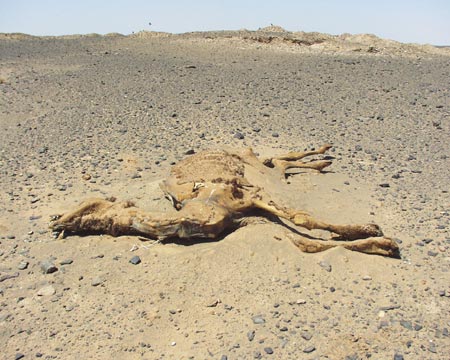 to vypadá, když se to přežene a hupne se z duny moc rychle a kolmo - naštěstí to odnesl jen nárazník a my společně pomalu vyjíždíme s písečných dun, kde míjíme mumii velblouda.