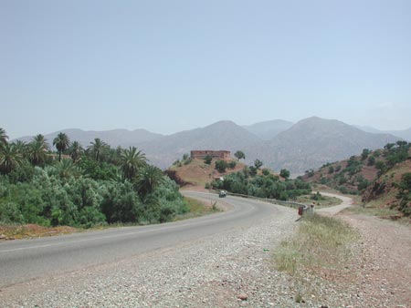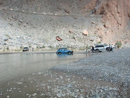nádhernou soutěskou, ve které nás běžní turisté sledovali ze silnice nad kaňonem. Večer táboříme v oáze "Source Bleue de Meski".