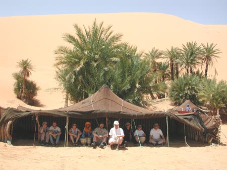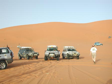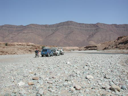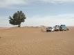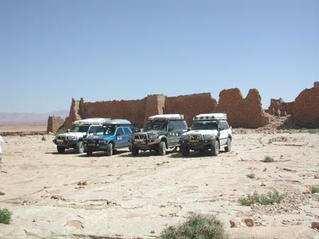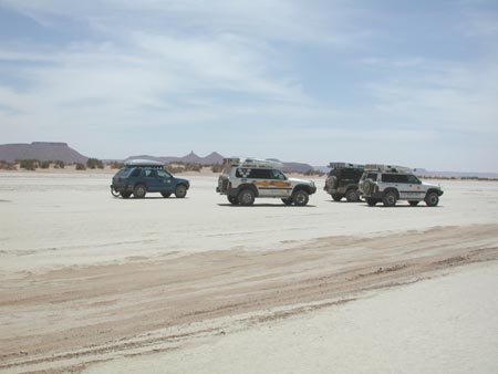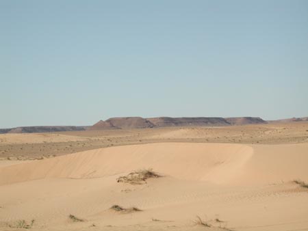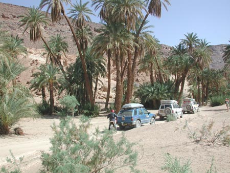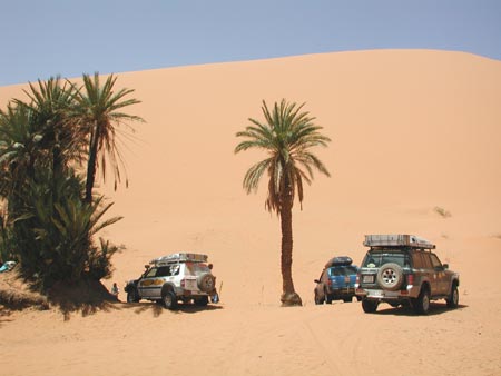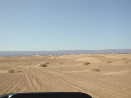 Jedeme pouští podle Alžírské hranice směr Mhamid. Za dva dny jsme urazili pouhých 230 km a spotřebovali 50 l nafty. Mně vytekl ve 100 km rychlosti do 40 cm hluboké příčné díry úplně přední tlumič, a tak se změnila jízda po kamenné poušti v peklo - už je tlumič koupený a vyměněný. Jinak super zážitky - 15 m před Alžírskou hranicí nás zastavuje GPS, v 500 m vzdálené oáze je už Alžírská posádka, pak již vědomě překračujeme hranici i o 2 km, jiná cesta není. Táboříme 600 m za Alžírskou hranicí na samotě v poušti. Ráno pokračujeme Hamadou (kamenná poušť) směr Mhamid.