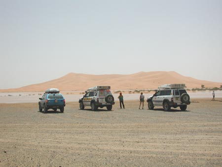 Večer civilizovaný kemp v Mhamidu. Ráno pokračujeme po jižní hranici na západ. Další dobrodružství nás čeká při cestě přes duny Čegaga, kde přišel ke slovu i naviják. Před večerem ještě rychlostní maratón vyschlým jezerem Iriki. Pak nás čekalo přenocování v poušti. Po ranním probuzení jsme pochopili, že se člověk s pouští nezžil, neboť se pachtí přes den pouští v úmorném vedru a v noci spí. Ostatní živočichové to dělají právě naopak - poušť ožívá v noci a vy ráno zjistíte co se všechno kolem auta plazilo a plížilo.