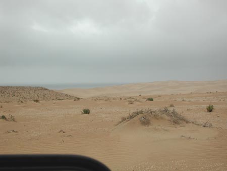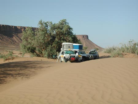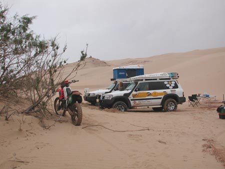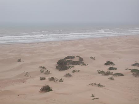 Noc jsme strávili v dunách u pevnosti Aoreora "pod ochranou marocké armády" - vojáci nám poradili, že až začne ráno odliv, můžeme překonat pobřeží v délce 40 km po plážích, které jsou při přílivu zaplavené. Tak ráno začalo naše poslední dobrodružství - nejdřív překonat duny, dostat se na pláž a pak se orientovat v různě tvrdém písku, který nesouměrně pokrýval pláž. Po chvíli jsme odhadli kde je nejlepší držet stopu a dál jsme to valili stovkou. Prostě zážitek, na který se nezapomíná.