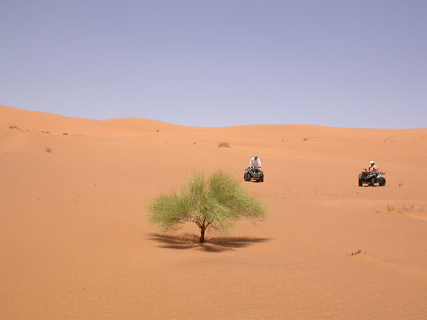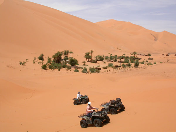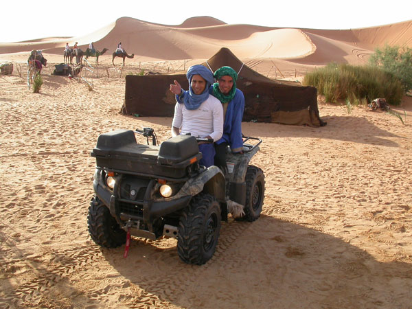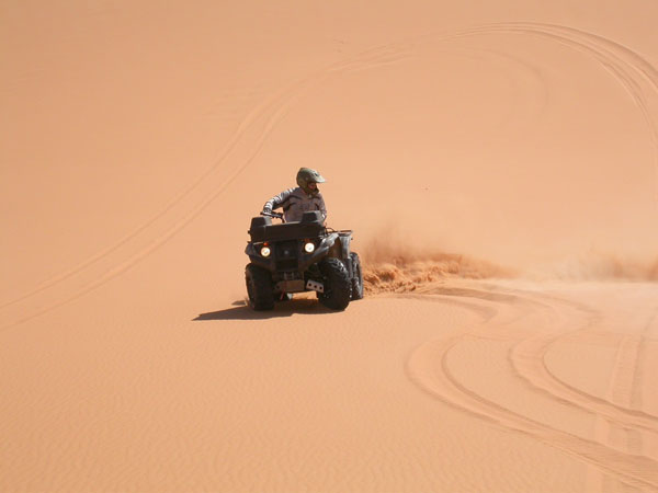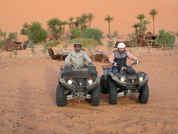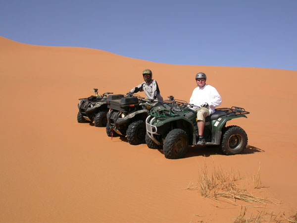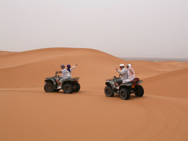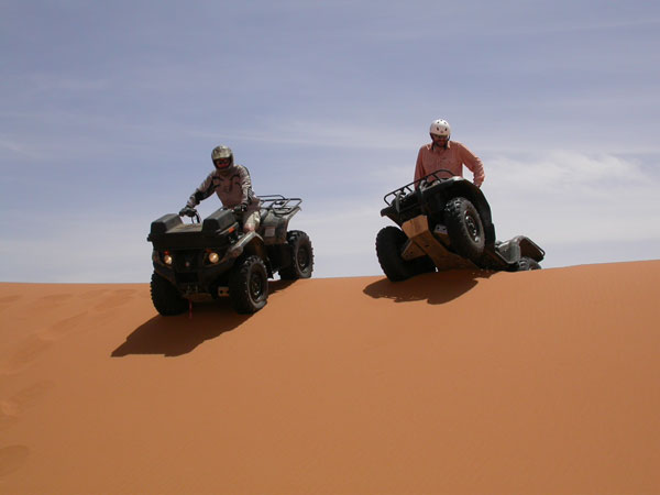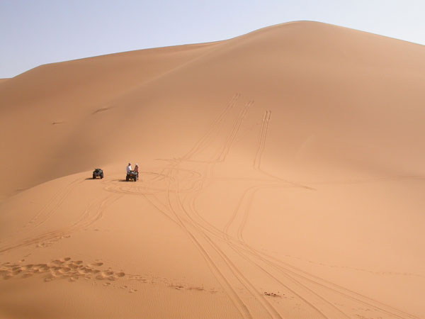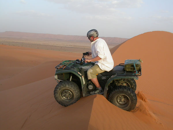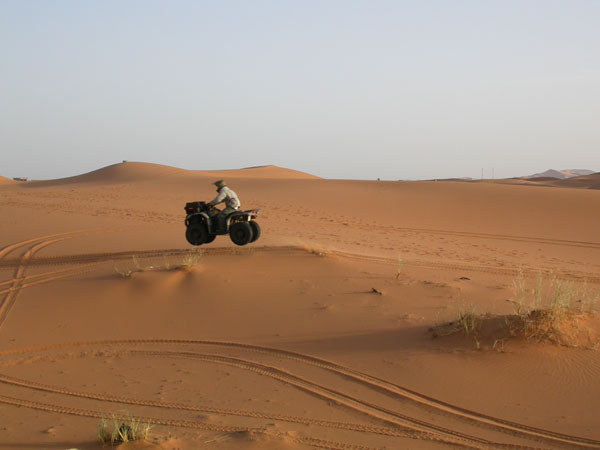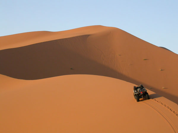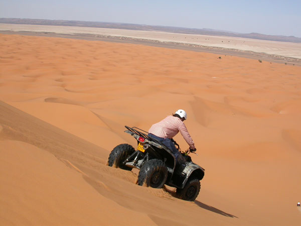 na Erg Chebbi k dunám vysokým až 100 m. Naše čtyřkolkářské dobrodružství začalo, dal jsem napotřetí tu 100 m dunu - nahoru adrenalin, dolů odvaz!
