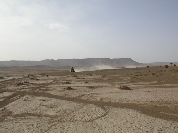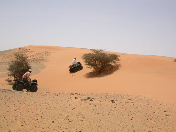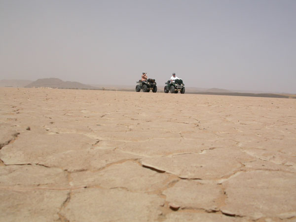 Horko nás natolik zmohlo, že jsme na dvě hodiny usnuli v příjemném chládku hliněných pokojů. Pak jsme udělali údržbu na čtyřkolkách a kolem šesté vyrazili na západ slunce. Musím