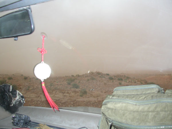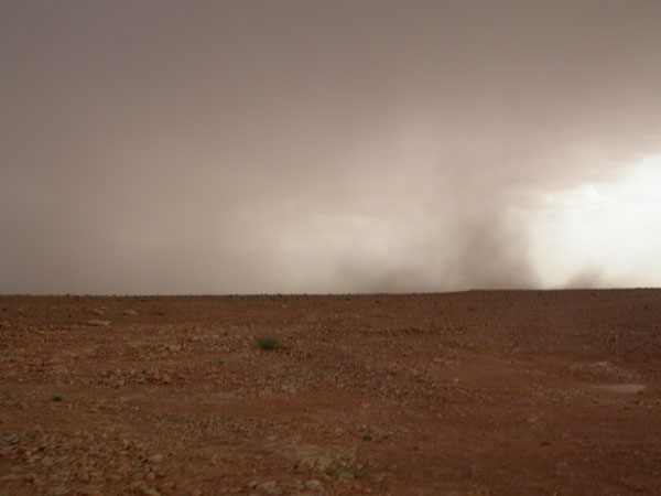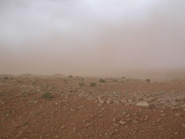 18.00 hod. - Tak jsme měli jít v šest k Hasanovi na večeři - tazin a místo toho sedíme zavření v pokoji. Přišla písečná bouře a venku to vypadá