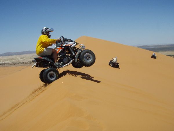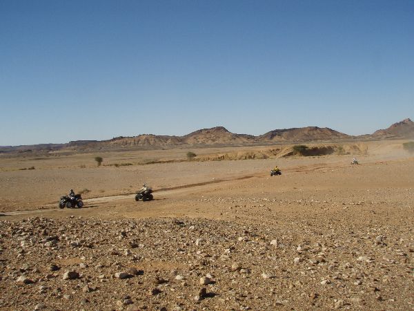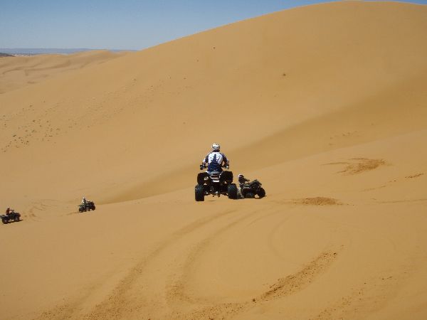 120 km. Vyjeli jsme v 8 hod. na duny. Hodil jsem svůj první "bůček", když jsme blbli - komplet jsem se otiskl i se čtyřkolkou do písku. Dojeli jsme nasbírat zkameněliny a pak Hamadou