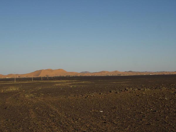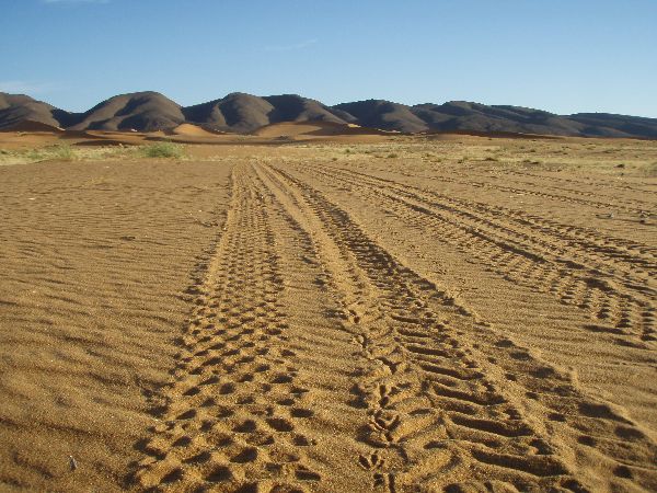 19.30 hod. - Před hodinou jsme dorazili za západu slunce do bivaku Ouzina. Byla to nádhera, do ruda zbarvené duny a hory lemující Alžírskou hranici. Cesta byla rozmanitá - pista černou