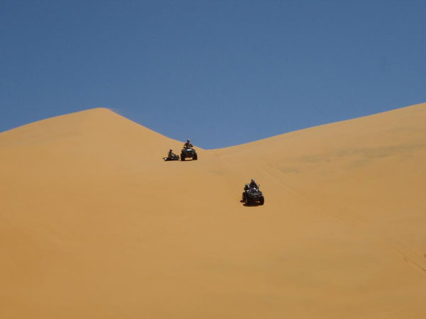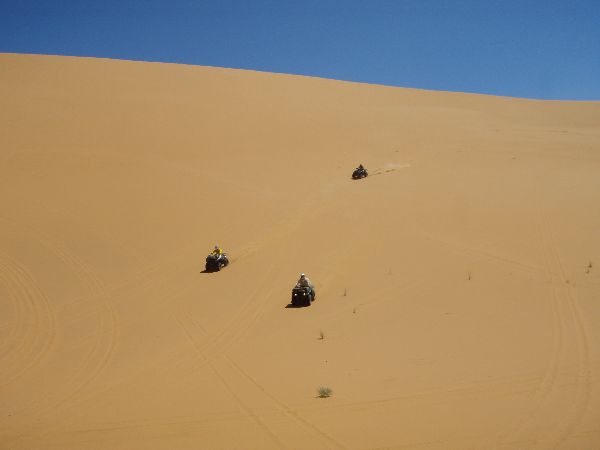 12.00 hod. - Tak jsme dorazili z dopolední projížďky - kluci jsou nadšený, je to adrenalin! Vyjet na 100 m vysokou dunu a za lomem hrany jí zhučet volným pádem dolů!