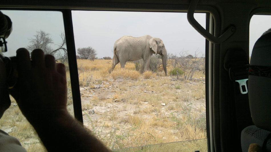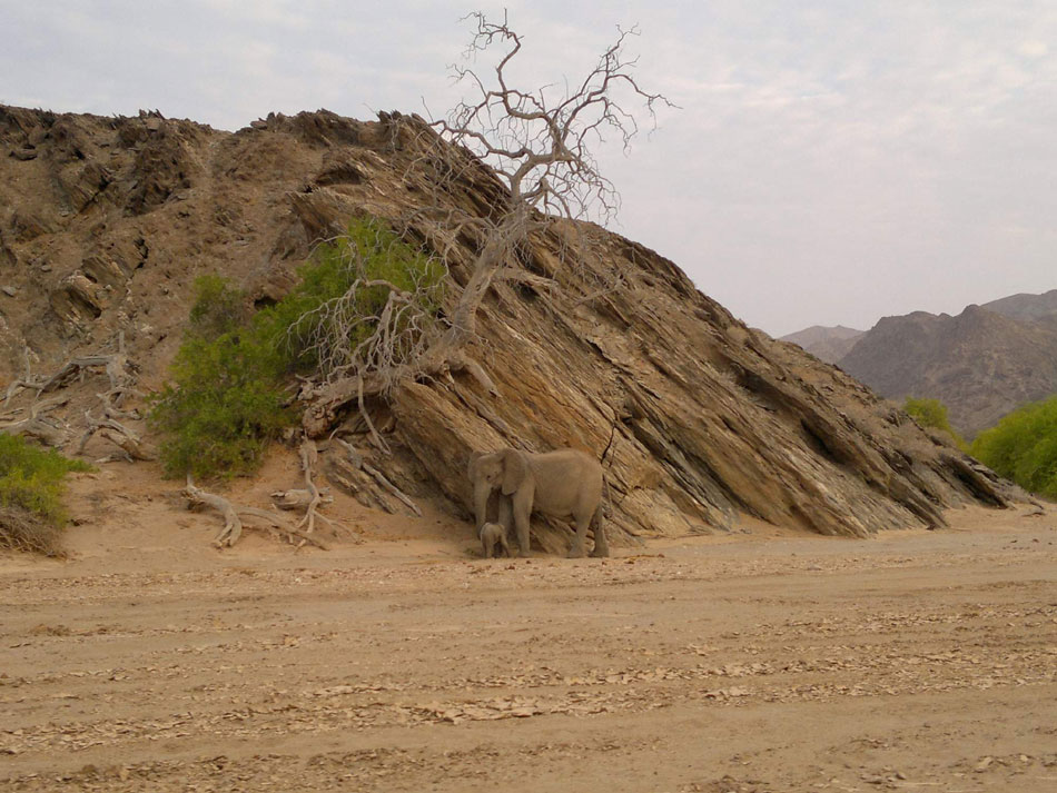 15:00 hod. - Včera v podvečer jsme vjeli do Hoanib River. Kromě nádherného západu slunce nás v řecwe přivítala asi 30 metrů od aut slonice s 2-týdenním slůnětem, pak 5 žiraf asi