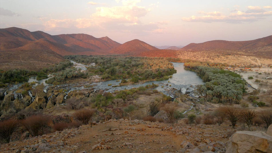 21:00 hod. - Po přesunu dlouhém cca 600 km jsme dojeli v 18:45, tedy před západem slunce na Epupa Falls, je tu spousta vody, v Angole muselo pršet. Byla to nádhera! Zítra ráno navštívíme