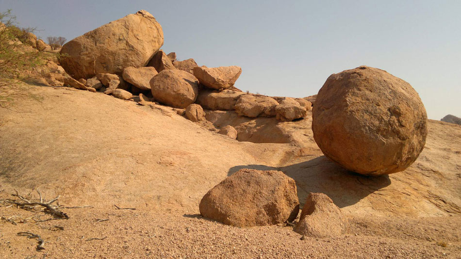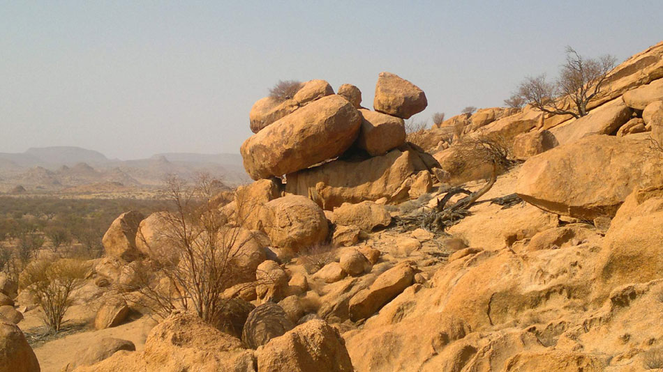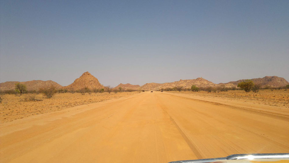 19:00 hod. - Dnes jsme přejeli do Damaralandu, na našem vozu třetí pneu v háji, jinak auta drží. Cestou jsme navštívili zkamenělý les, kde jsou zkamenělé klády staré téměř 3 miliony let.