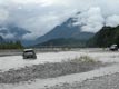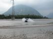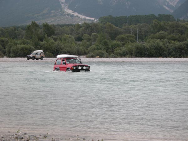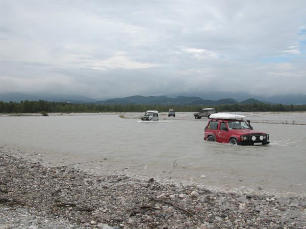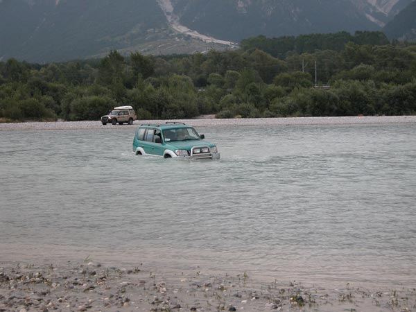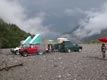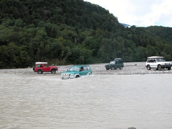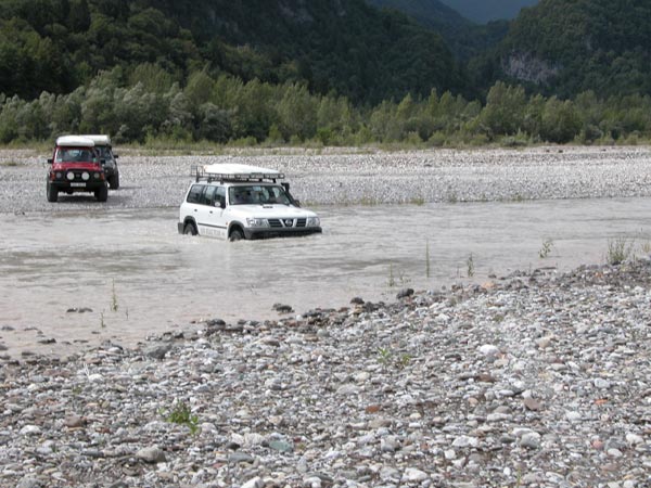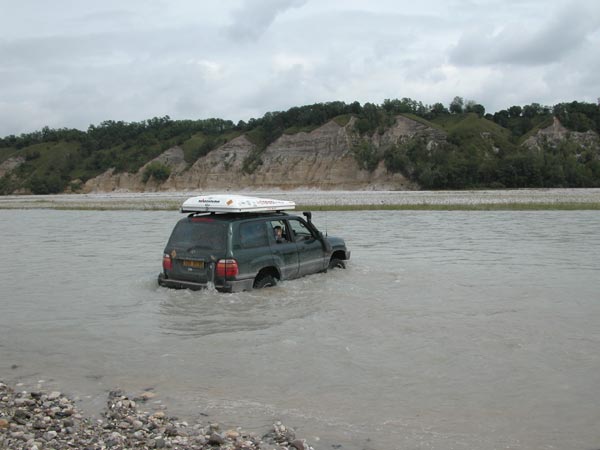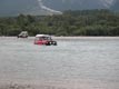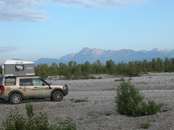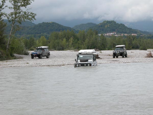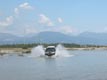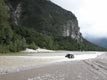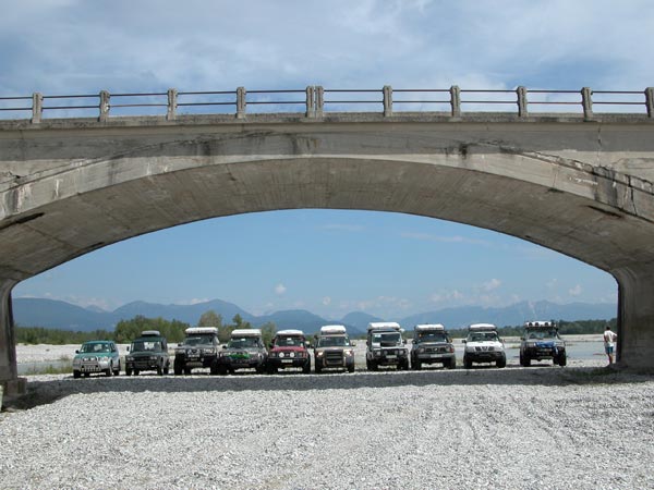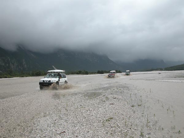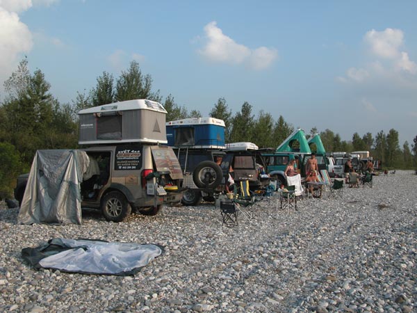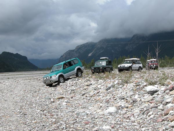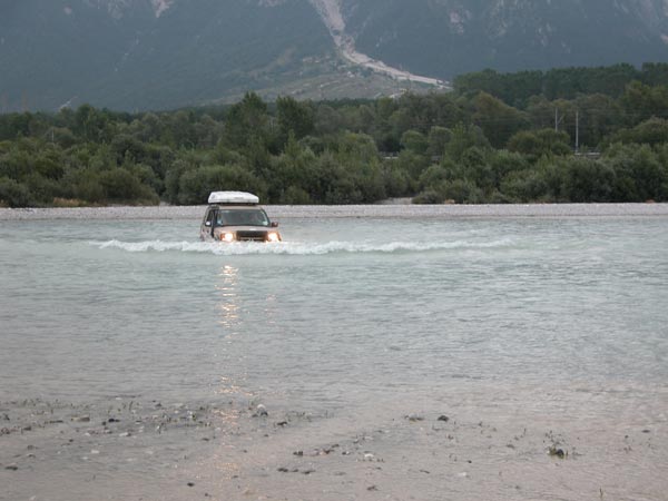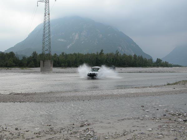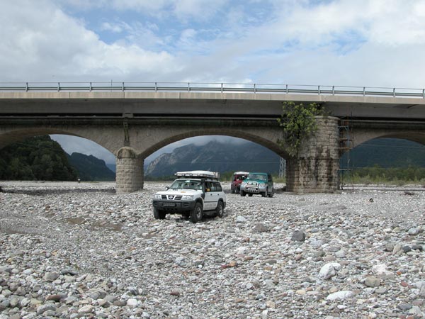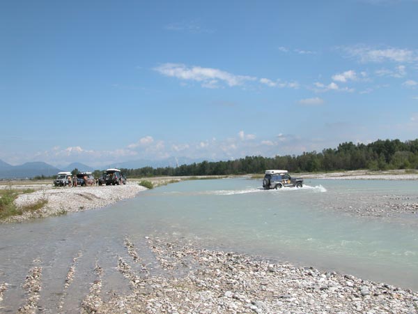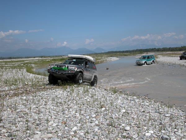 12 hod. - Tak dnes začala naše "plavba" Tagliamentem v počtu 8 teréňáků, dva ještě dorazí večer. Diskoška prošla právě vodním křestem.