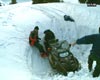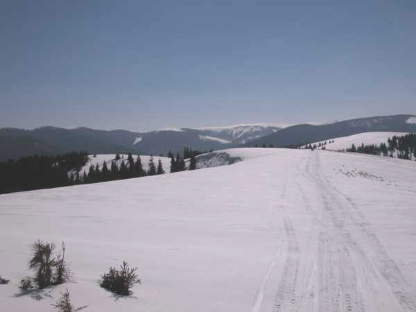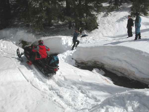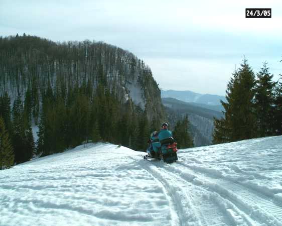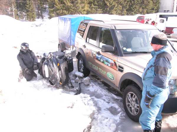 na vleku za autem. Skončili jsme totiž v 50 km vzdáleném údolí asi v 700 m.n.v., kde už nebylo dost sněhu pro skútry.