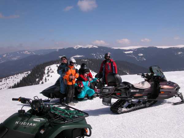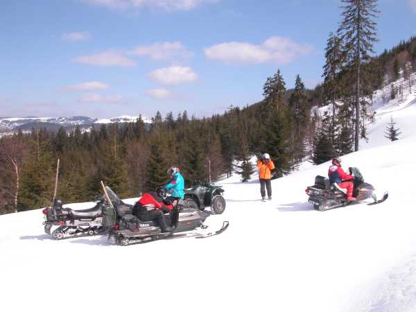 17 hod. - Tak jsme konečně zrealizovali výpravu na sněžných skútrech do rumunských hor. Bydlíme v horském hotelu