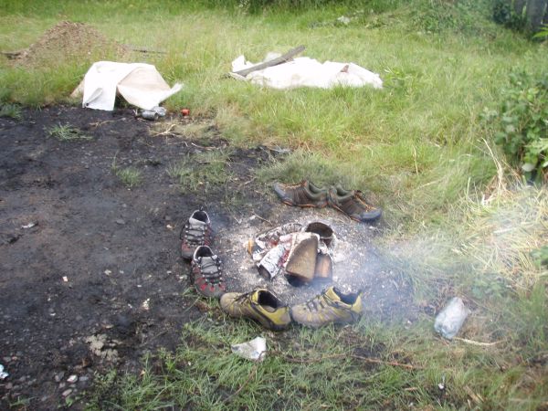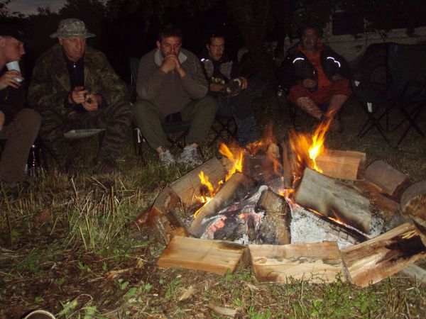 8.00 hod. - Tak konečně první večer u táboráku bez deště. Pěkně jsme si u ohně s kytarou a tamburínou zabékali :-). Pak jsme zadělali Medvědům zip na stanu stahovačkou,