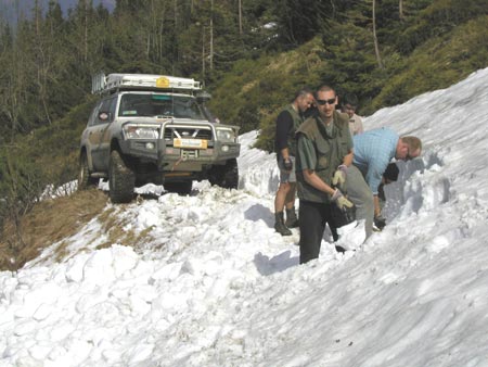 cestě vzhůru. Zastavuje nás lavina, která utrhla cestu. Jdeme do toho ! Navijákem nahoru a