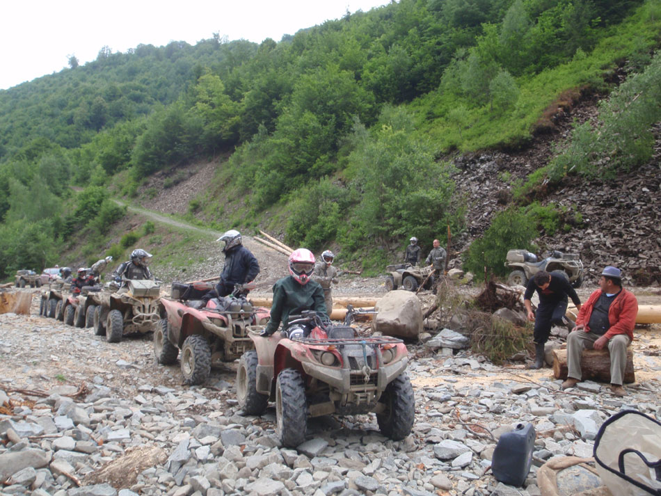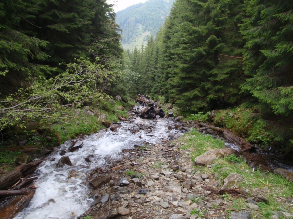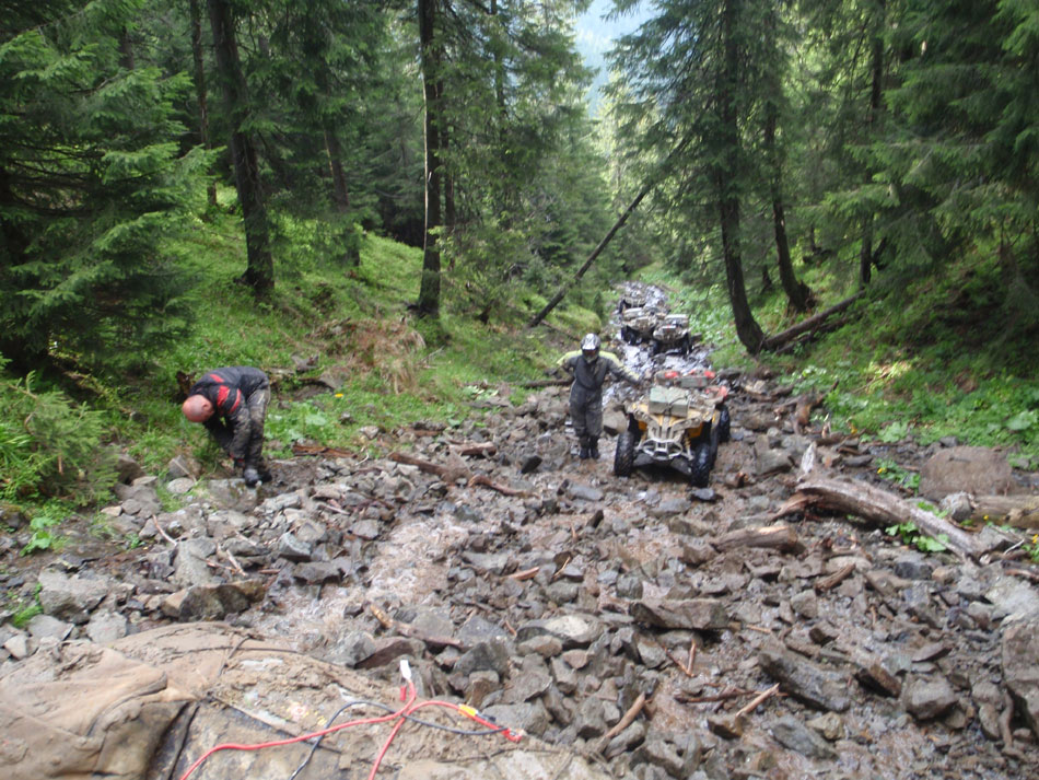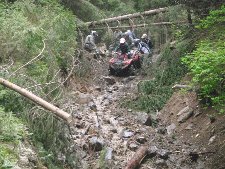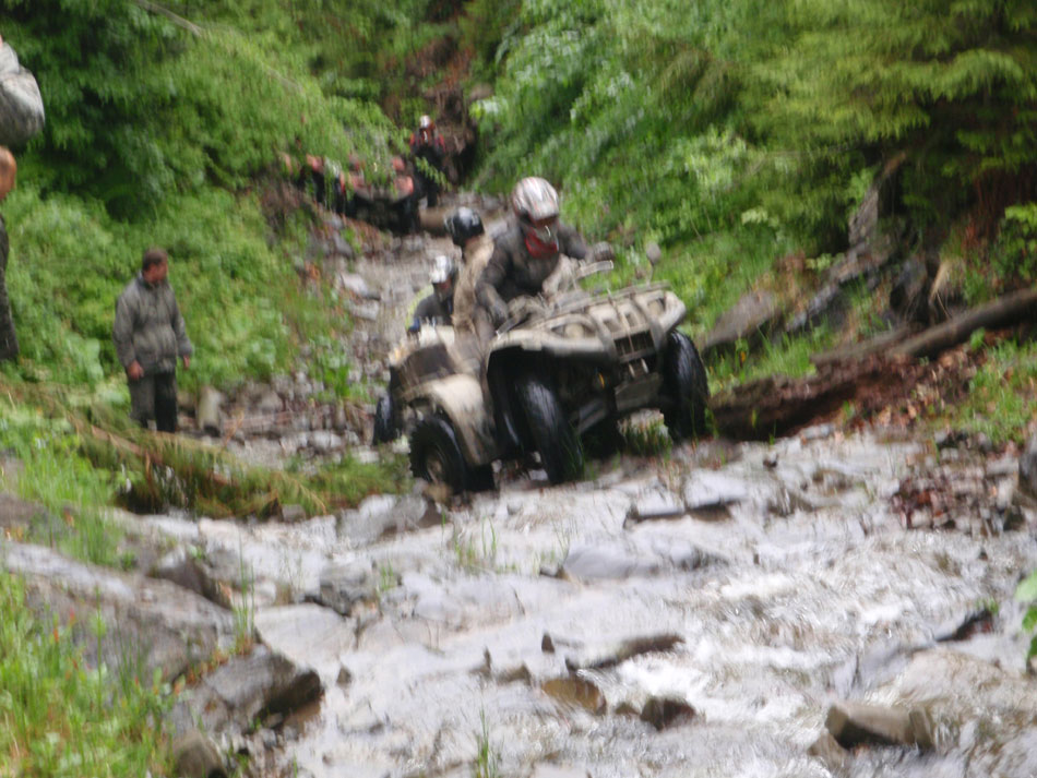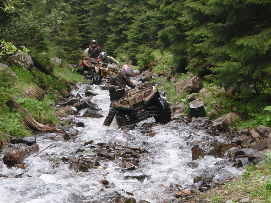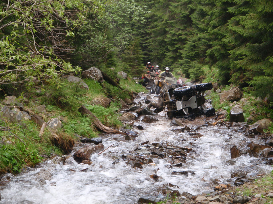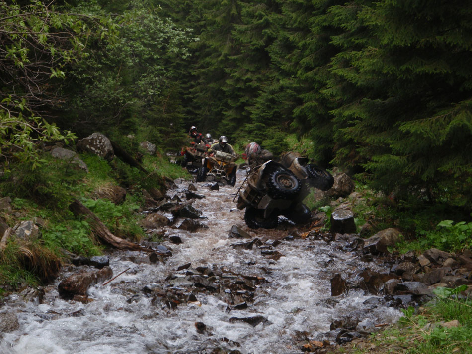 20.00 hod. - Počasí nám pořád nepřeje, dnes celý den pršelo, přesto jsme najeli 120 km. Při výjezdu potokem za Henu Mare dala jedna Grizzlina 6x pana-orel, ale jezdec i stroj OK, tak jsme se vrátili na hotel. Cestou