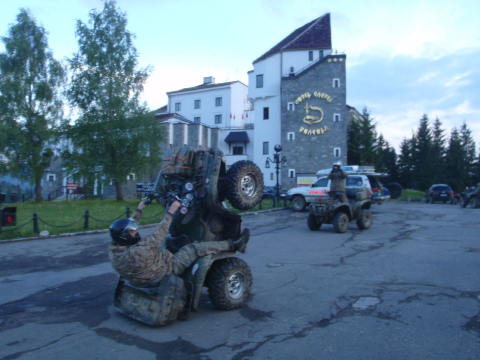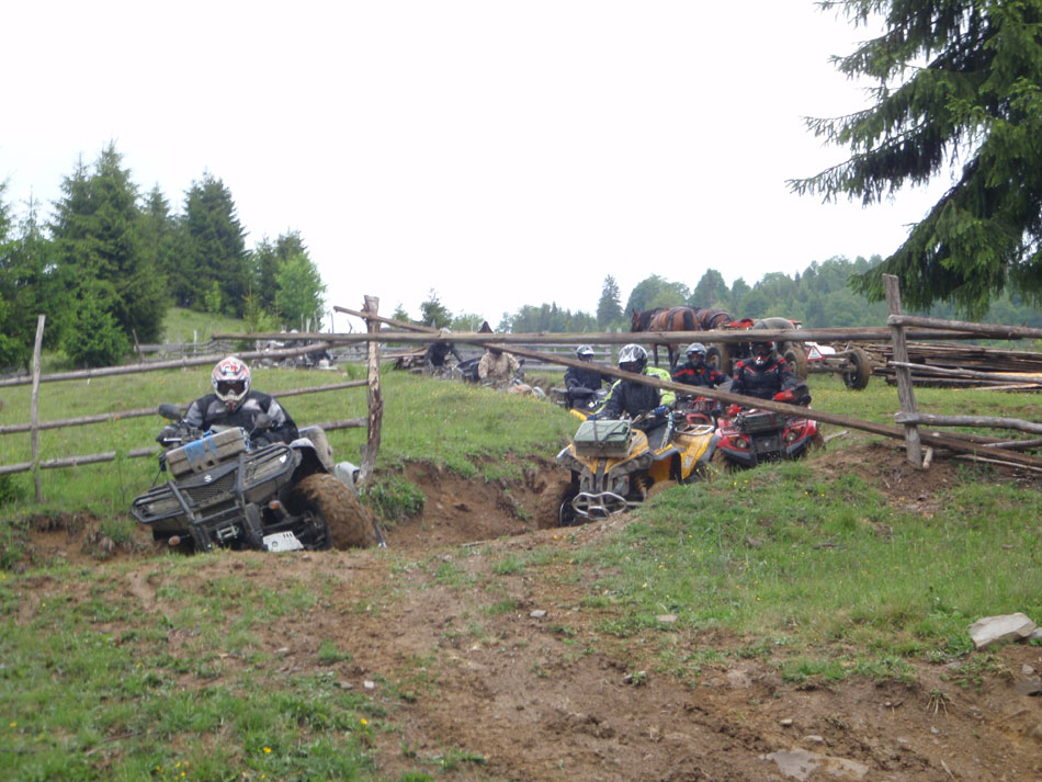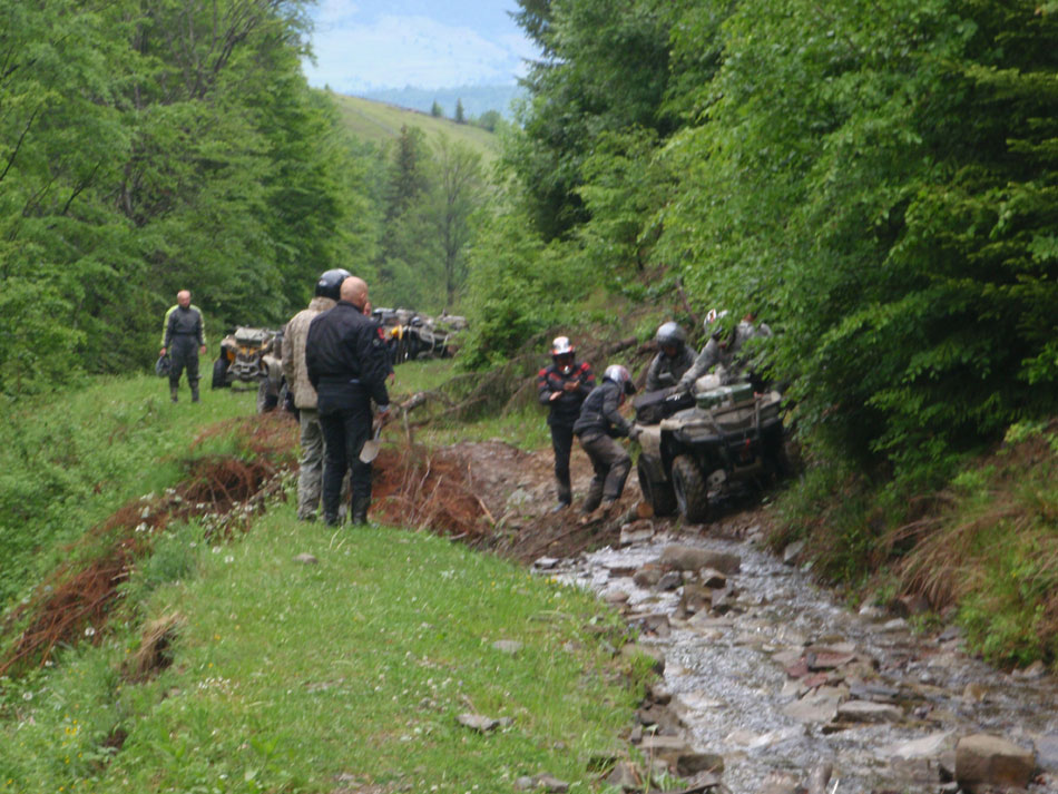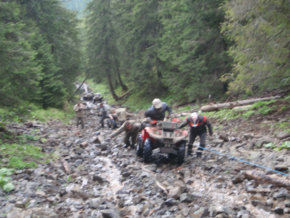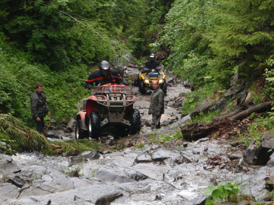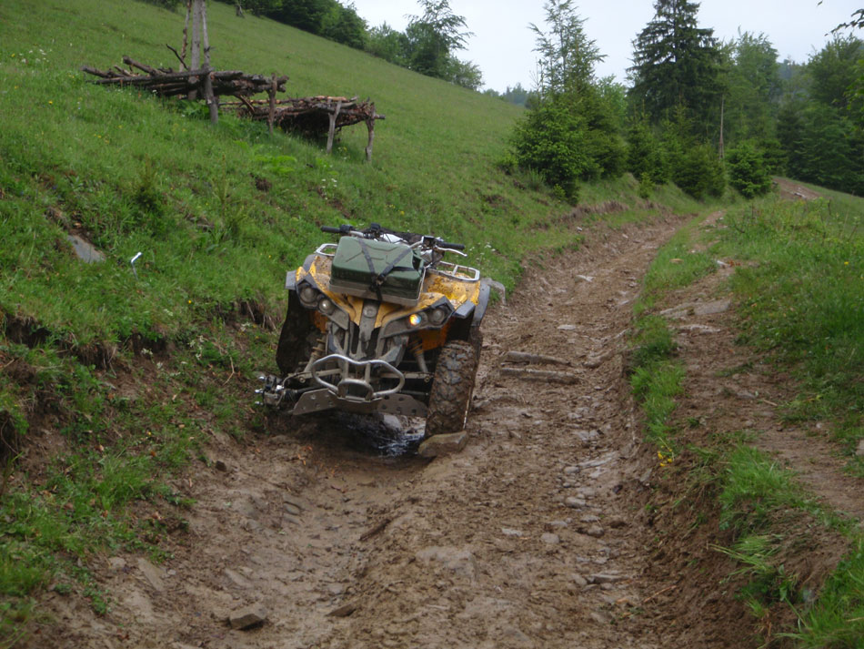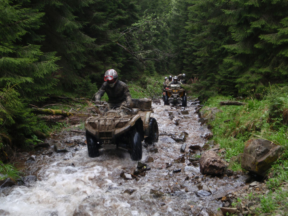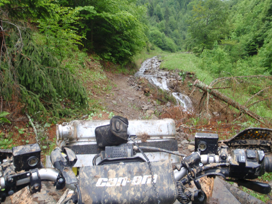 20.00 hod. - Počasí nám pořád nepřeje, dnes celý den pršelo, přesto jsme najeli 120 km. Při výjezdu potokem za Henu Mare dala jedna Grizzlina 6x pana-orel, ale jezdec i stroj OK, tak jsme se vrátili na hotel. Cestou