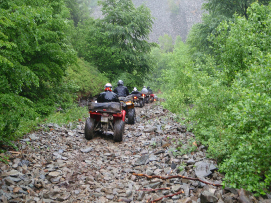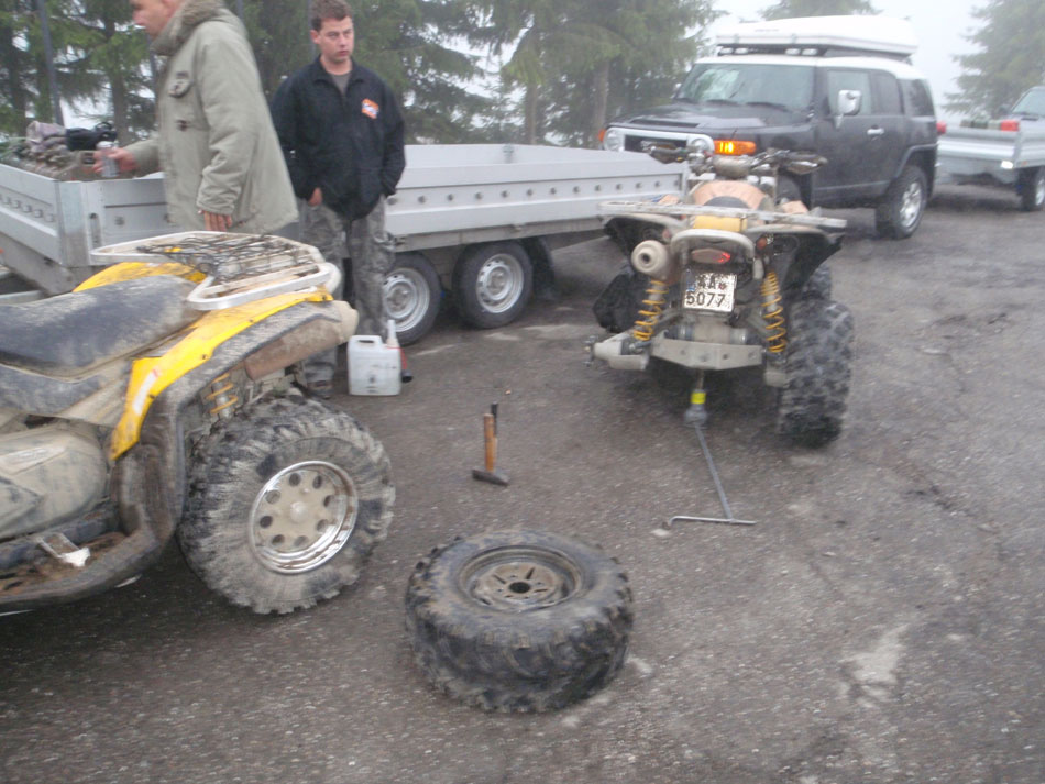 se navlékli do pláštěnek a vyrazili. Našli jsme pěknou úvozovku s rozporkama, pak jsme se vydali na brutální těžební cestu. Tam Suzuka ustřihla ventilek a my strávili 2 hodiny pokusem
