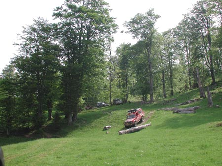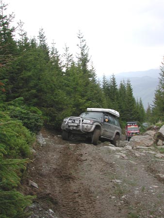 27.5.2002 - dobýváme Pietrosul, po rozpozporkách déšť, pak navijáky. Zastavuje nás až 400 m před meteorologickou stanicí sněhová plotna dlouhá 80 m. Počasí se umoudřilo, je jasno a nádherný rozhled. Cestou zpět na úplné rovině chytne nešťastně Fousor levým kolem břeh a převrácí auto na pravý bok. Naštěstí v nulové rychlosti - nikomu se nic nestalo. Auto má lehce poškozený bok. Problém je auto převrátit, je třeba do boku uvázat kladku a ani jeden strom... Zbývají kameny - první se vyvrací, druhý pokus je úspěšný, Patrol je zpátky na čtyřech - motor v pohodě. Vyrážíme zpět. Všechno dobře dopadlo.