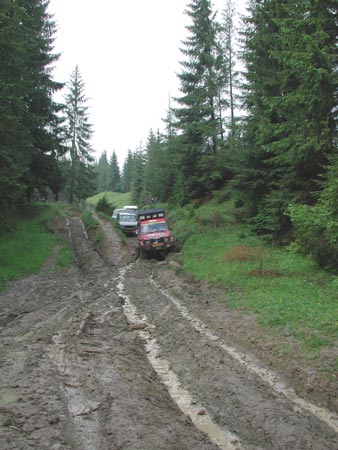 29.5.2002, 11 h - jen jsme opustili hotel Drákula, strhla se průtrž mračen - ten Drákula nám dává. Dojet dnes na hřeben bude "maso", už Rozporky jsou víc než akční.