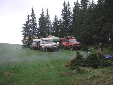 26.5.2002 - včera bez signálu. Dopoledne po zelených hřebenech a pak úvozem do údolí, tady už na nás čekají "Mirečci", kteří se kvůli opravě zdrželi v Čechách. Kolem druhé za slunného počasí vyrážíme v kompletním počtu 6 teréňáků na prohlídku zlatonosné štoly. Při zpáteční cestě se strhává průtrž mračen. V táboře stavíme auta proti sobě, abychom mezi ně roztáhli plachtu. Prší až do 19 h, pak rozděláváme oheň.