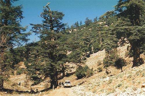 Cedrové háje. Tyto atlaské cedry jsou variantou cedru libanonského a dosahují až 40 m výšky a 9 m po obvodu, rostou